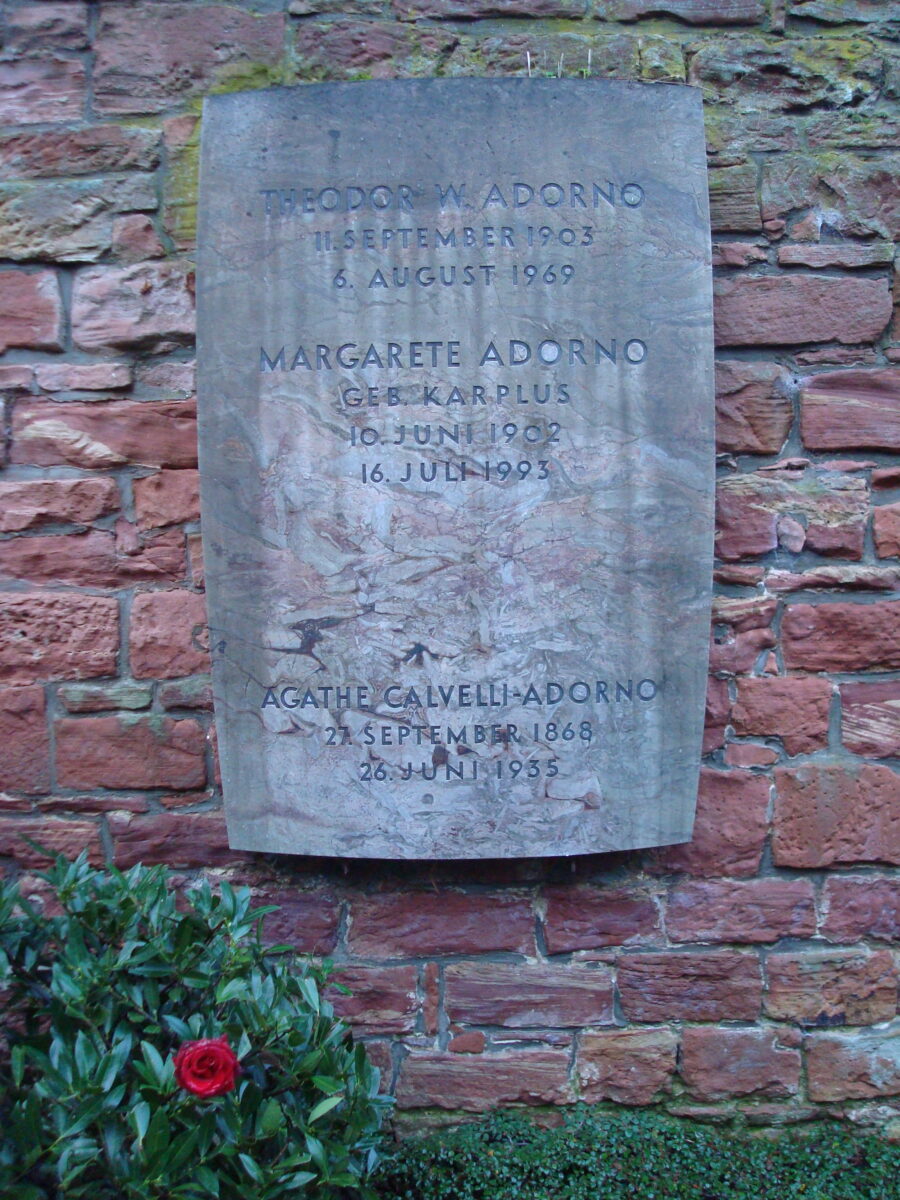 Adornos Kritik an der Popkultur gilt als überholt, denn diese Kultur hat eindeutig gesiegt: im Fernsehen, im Internet und überall. Dennoch kann man behaupten, dass dieser Sieg seine Rechtmäßigkeit noch verstärkt hat. Nur wer sieht das schon? Adorno ist fast vergessen. Dass sein Name auf der rauen Marmorplatte über seinem Grab vom Regen fast ausgelöscht ist, ist ein schönes Beispiel dafür. Und für seine Unlesbarkeit. Die Namen seiner Mutter und seiner Frau sind deutlicher zu lesen. Auf dem Grab steht ein Lorbeerstrauch mit einer Rose darin. Zu Recht: Der Lorbeer ist das Attribut Apollos, und Apollo ist der Gott der Musik. Und des Orakels. Die Rose steht für Revolution.